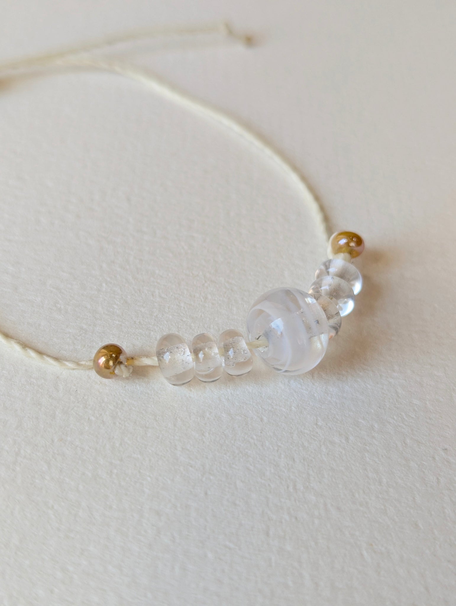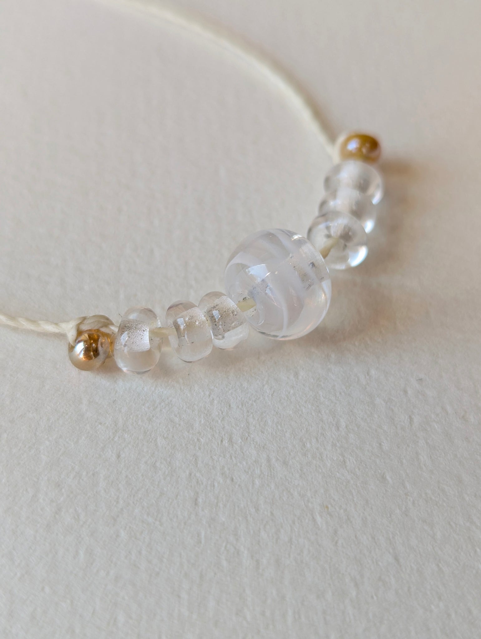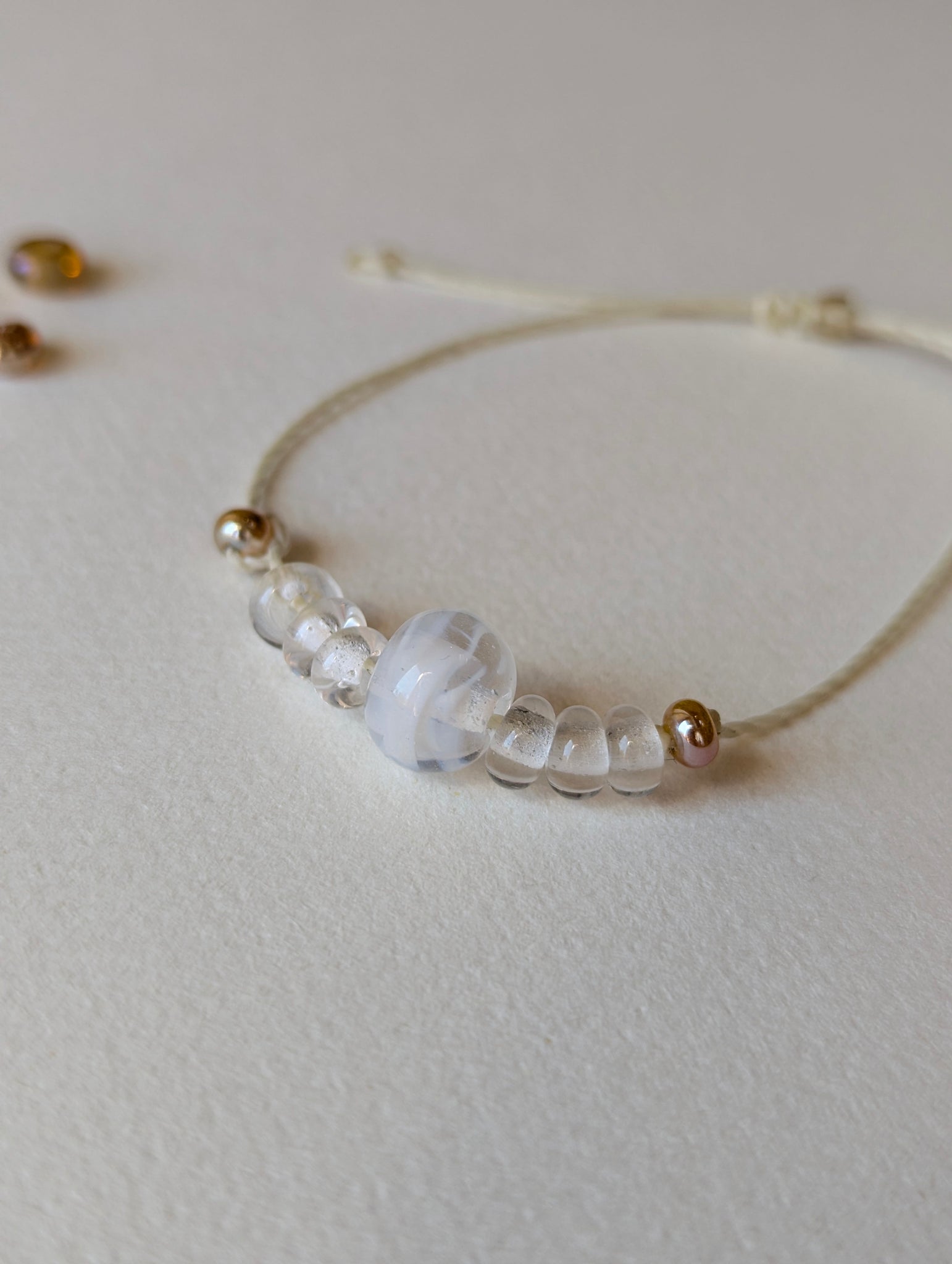 Paix est composé de perles en verre filé main, transparentes et lumineuses, façonnée une à une.