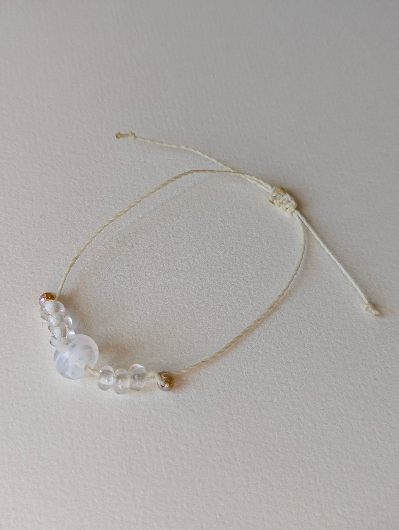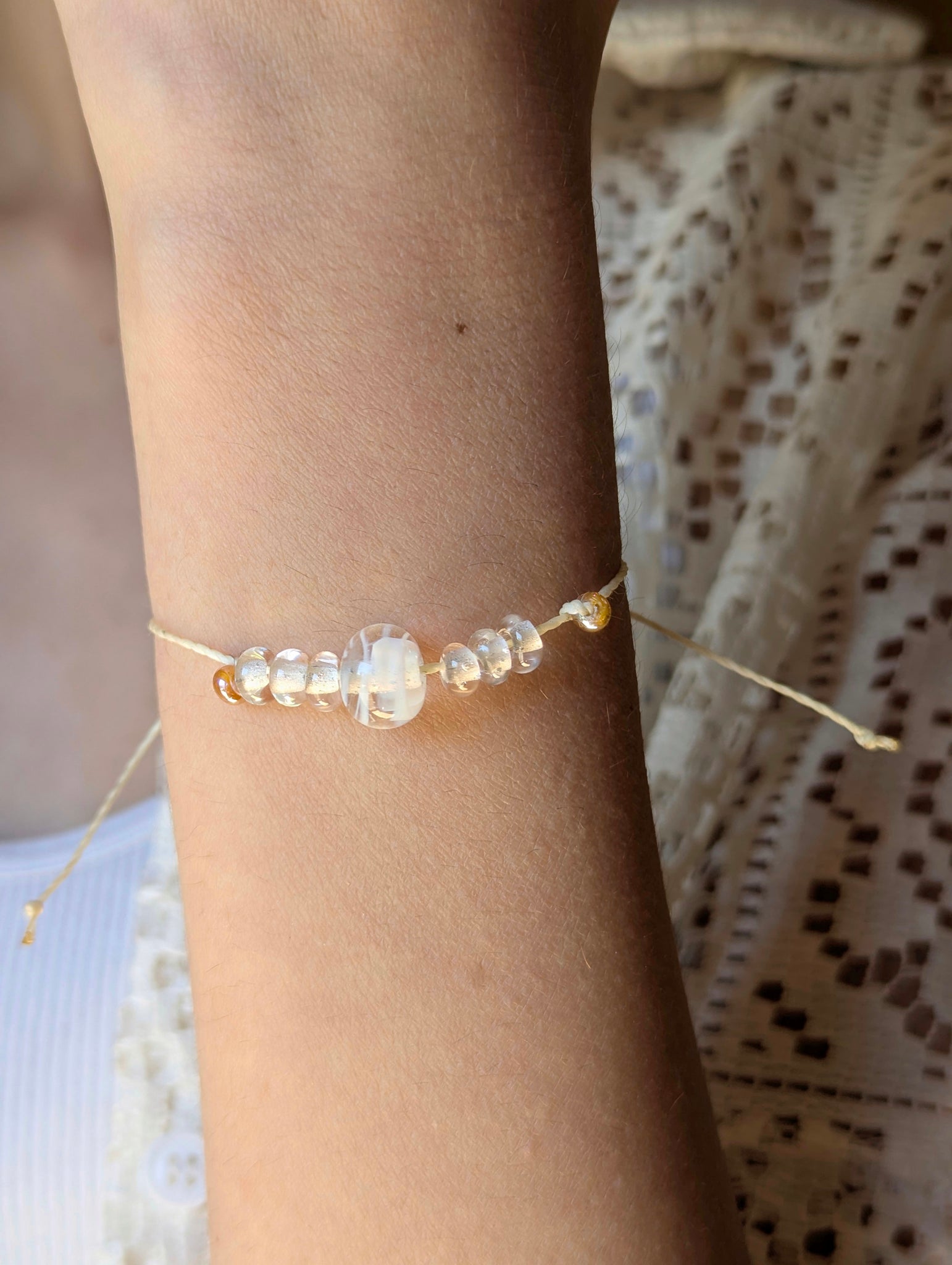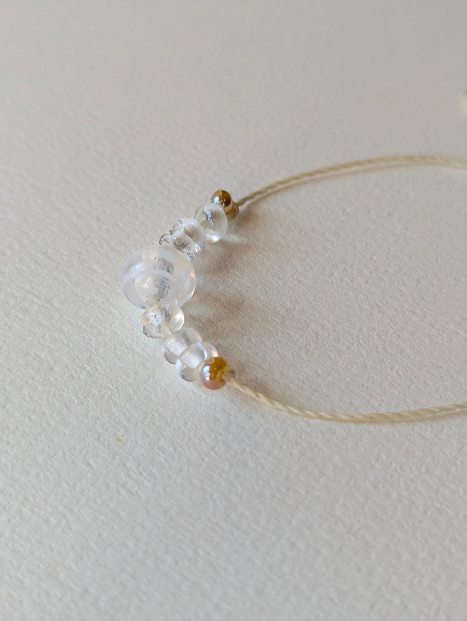 Paix est composé de perles en verre filé main, transparentes et lumineuses, façonnée une à une.